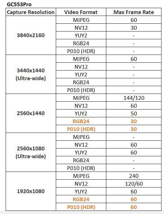 Please refer to the supported passthrough and capture resolutions below. For each input resolution, the supported capture resolution is shown as supported by GC553Pro.