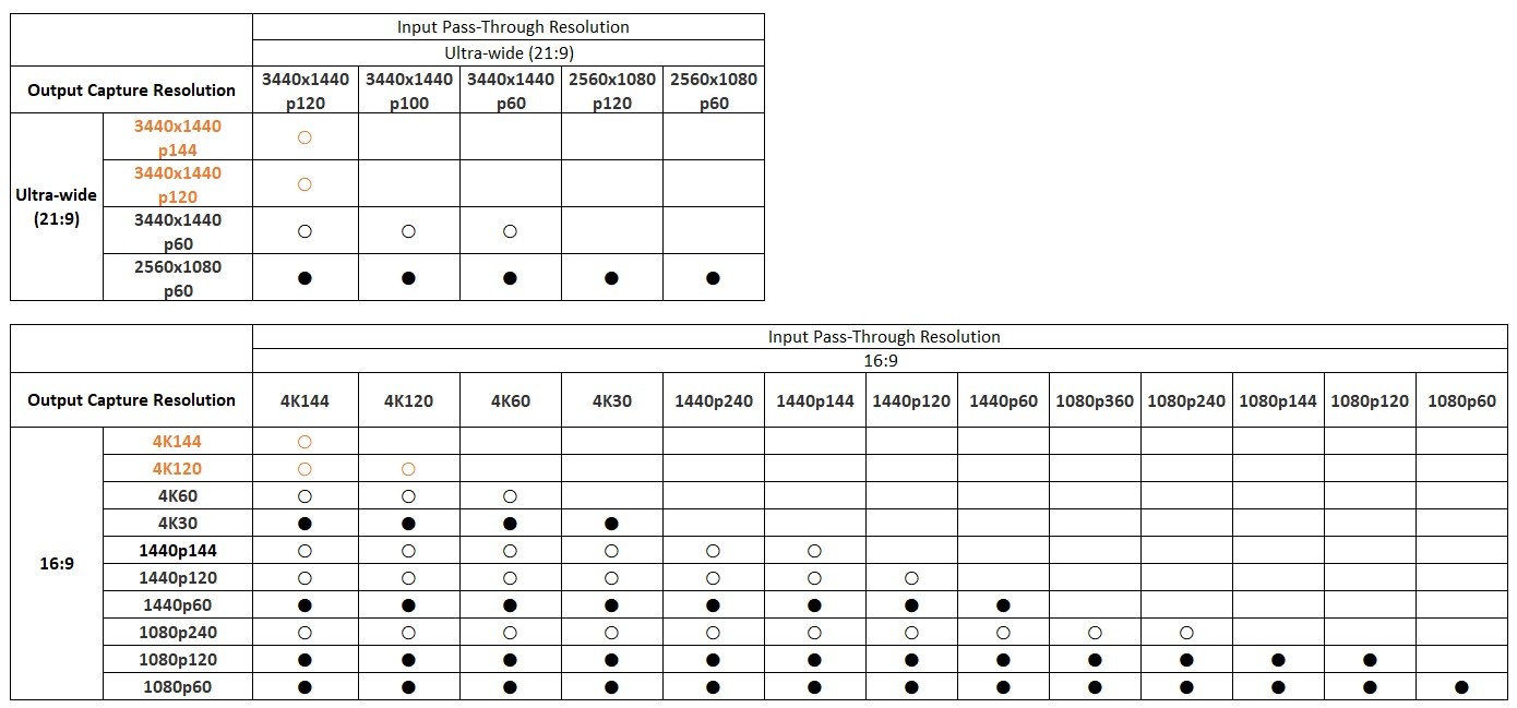 ●凡例: ○ SDRのみキャプチャ可能 / ● SDR、HDRでキャプチャ可能