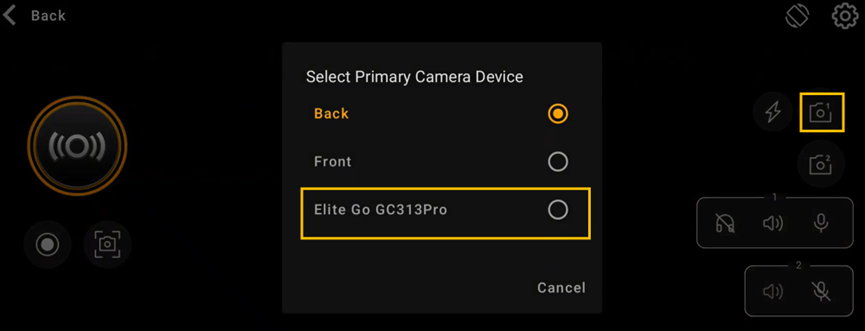 - カメラアイコンをタップし、メインカメラデバイスを信号ソースに設定します。