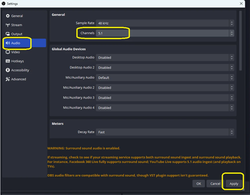 Audio タブで「5.1」を選択し、Apply をクリックしてください。
