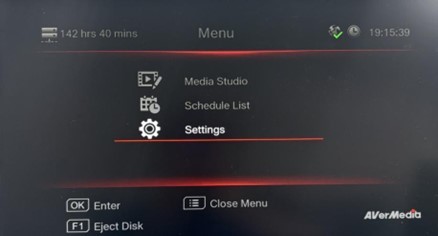 2. Set up the ER330’s network. Turn on the ER330, use the remote control to open the menu, scroll to 'Settings,' and select it: