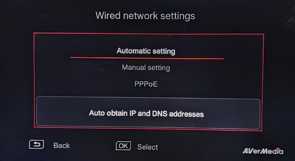 Press the Back arrow to return to Settings; you will see that 'Automatic Setting' is selected under Network: