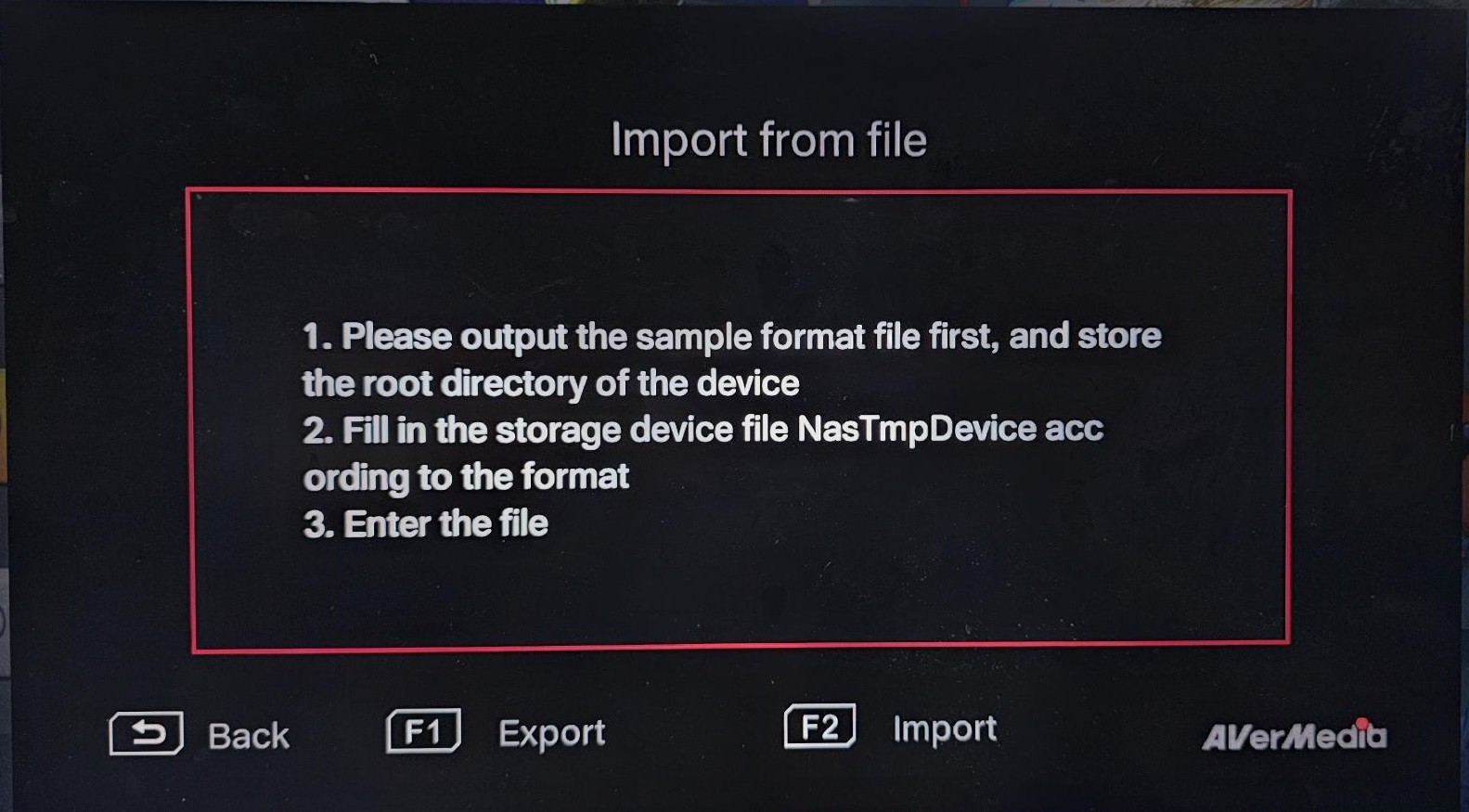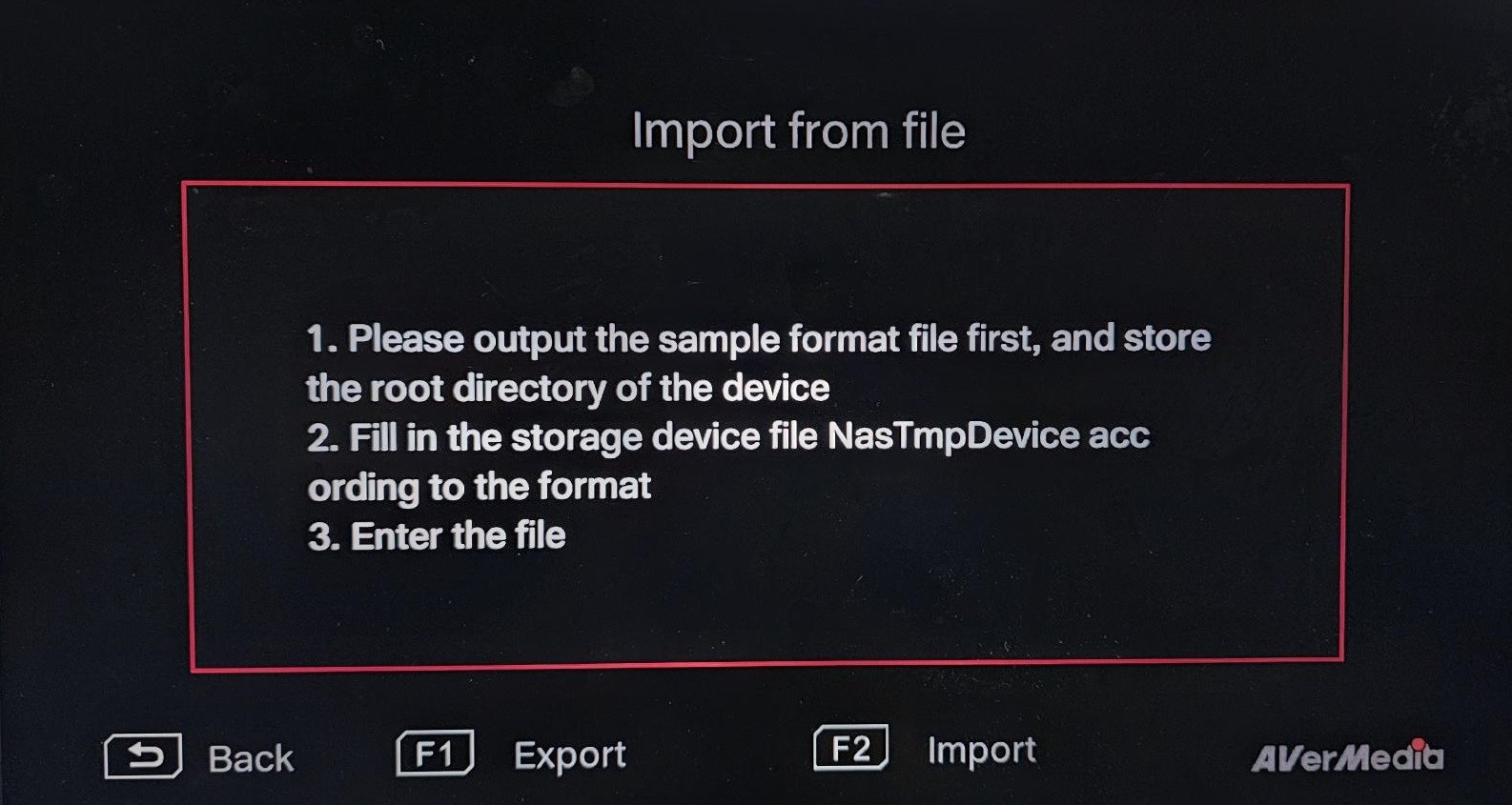 - Press F1 and choose 'Export'. Press F2 to export the NAS configuration file. This way, the NasTmpDevice.txt file will be saved in the external hard drive connected to ER330.