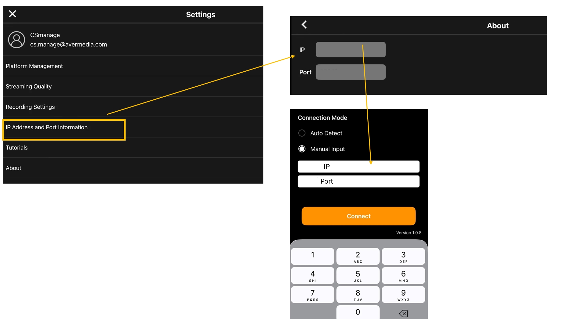 • iPad が表示されない場合: iPad の Live Streamer App で 設定 → IPアドレス&ポート を確認→iPhone の LiveStreamerLink で Manual Input を選択 → iPad の IP アドレス&ポートを入力→iPad のプレビューページに戻り → 2番目のオーディオソースのマイク をタップ → iPhone を選択