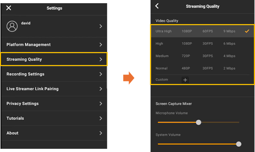 - Streaming Quality をクリックして 映像品質 を設定します。